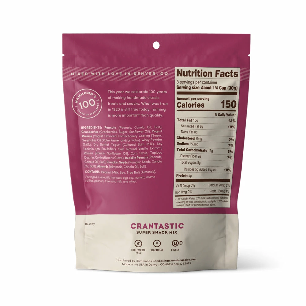 Looking for a delicious and healthy snack option? Our Crantastic Snack Mix is the perfect choice! This blend of sweet and savory ingredients includes cranberries, peanuts, yogurt raisins, pepitas, and almonds. With their anti-inflammatory properties, the tart and slightly sweet cranberries add a burst of flavor. Meanwhile, the crunchy peanuts, pepitas, and almonds provide a satisfying texture and a boost of protein and healthy fats. Whether you need a quick snack to fuel your day or a treat to enjoy on a hike, our Crantastic Snack Mix is sure to satisfy your cravings and keep you energized.