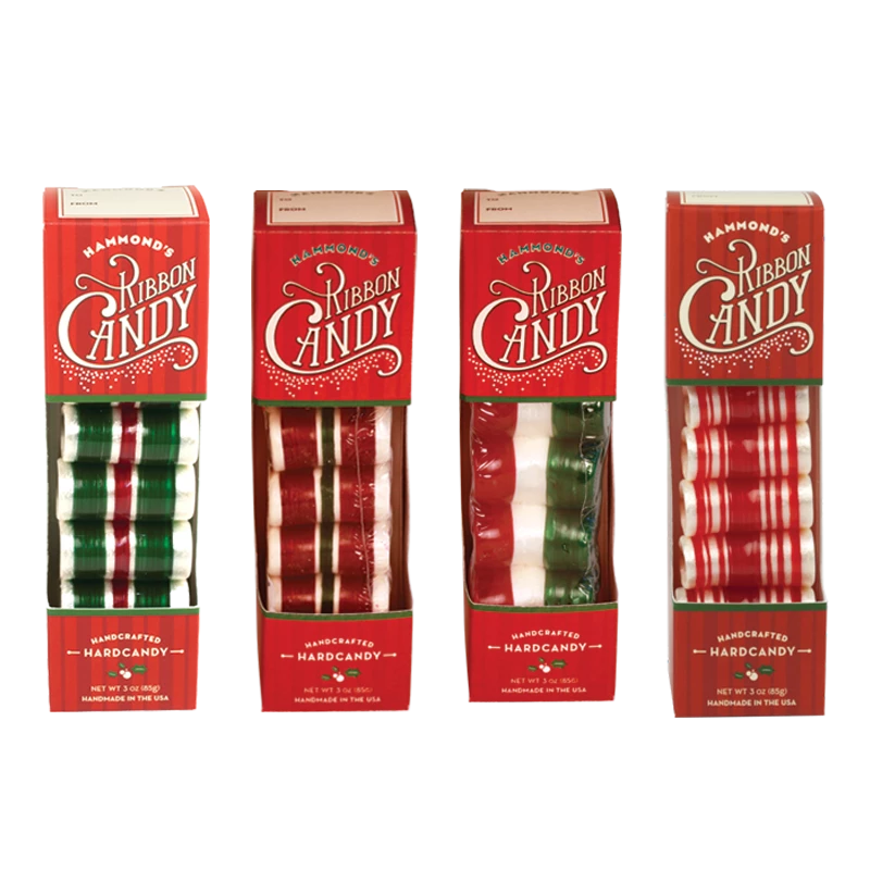 Nostalgic Ribbon Candy strips are a delicious way to share the spirit of the holiday season. Perfect for gifts, place settings, holiday recipes, and, home decor. This assortment will include Clove, Cherry, Cinnamon, and, Natural Peppermint. Each Ribbon Candy is individually wrapped.